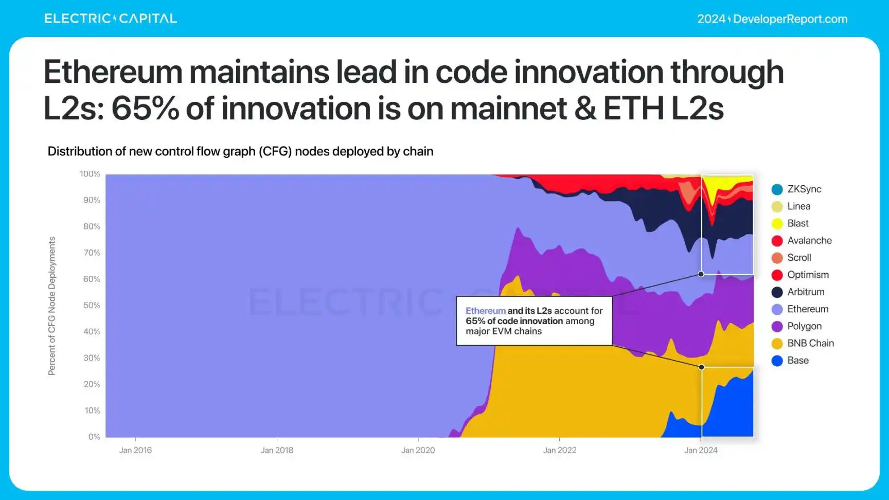 这就是以太坊生态系统保持代码创新领先地位的方式——通过 L2 链。65% 的创新发生在主网和 ETH L2 链上。