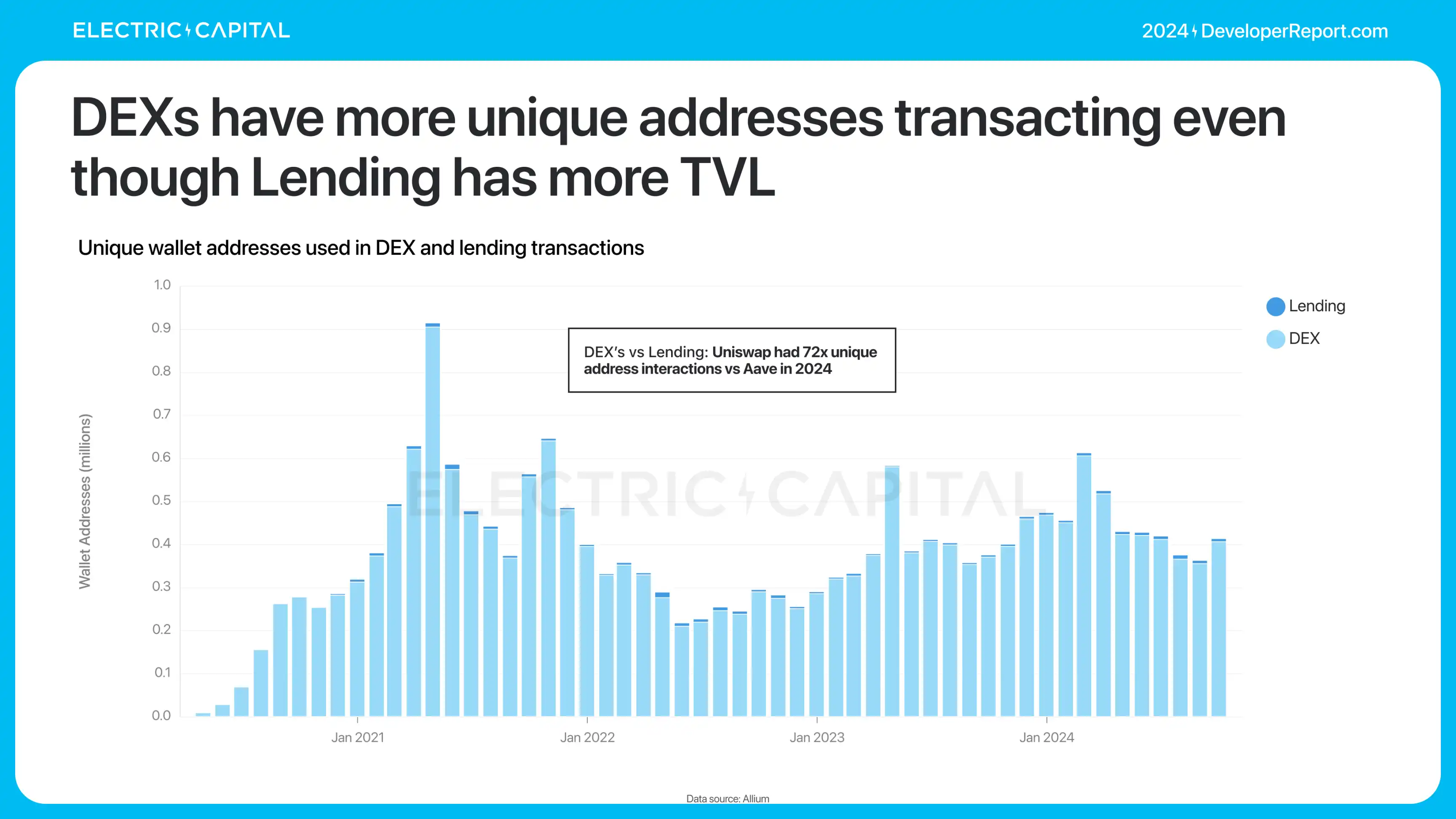 TVL 并不是我们理解 DeFi 使用情况的唯一指标。尽管借贷平台的 TVL 是 DEX 的 3 倍,但 DEX 的唯一地址交易量更多。举个例子——DEX 与借贷平台的对比: 2024 年,Uniswap 的唯一地址互动是 AAVE 的 72 倍。