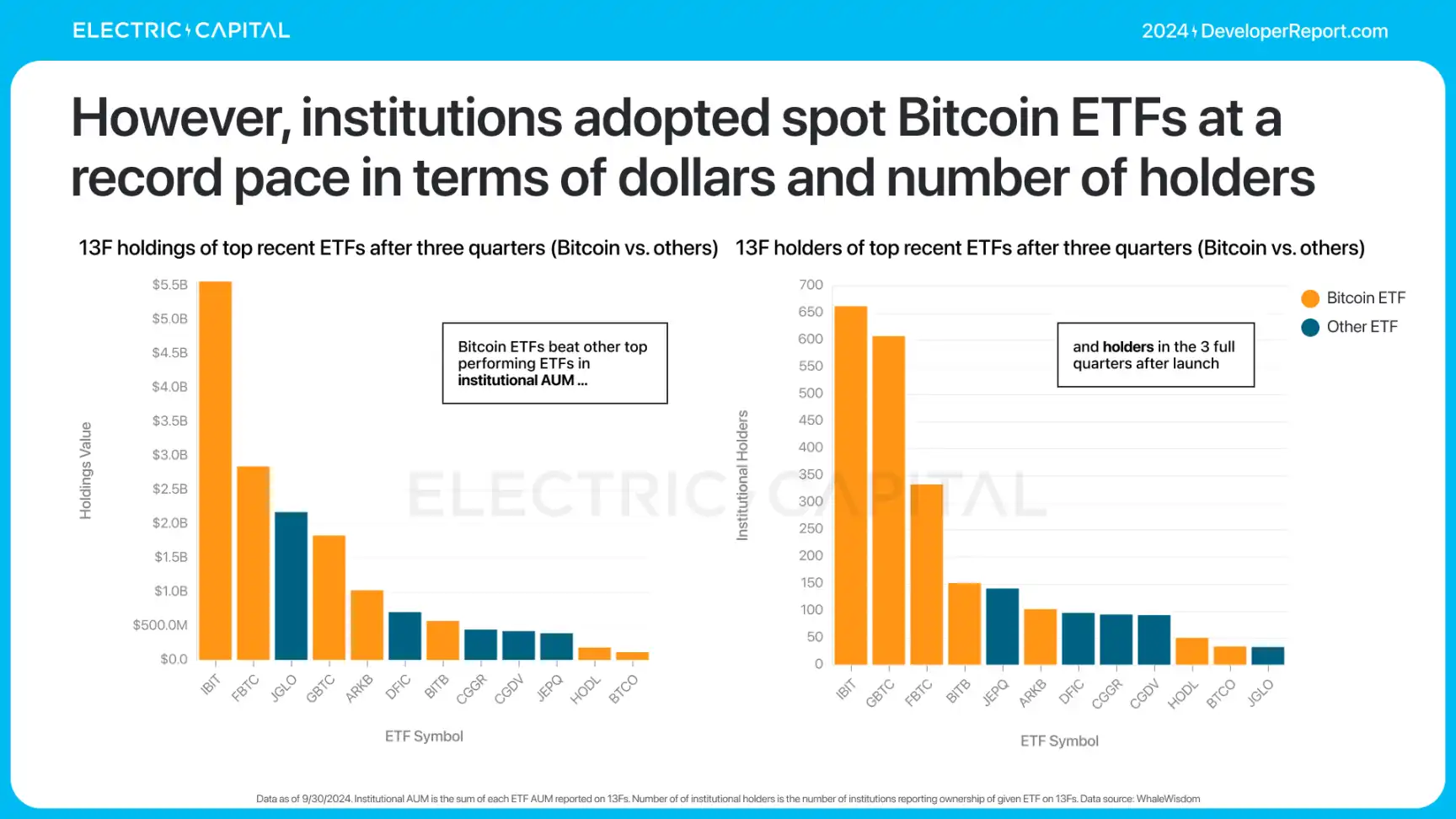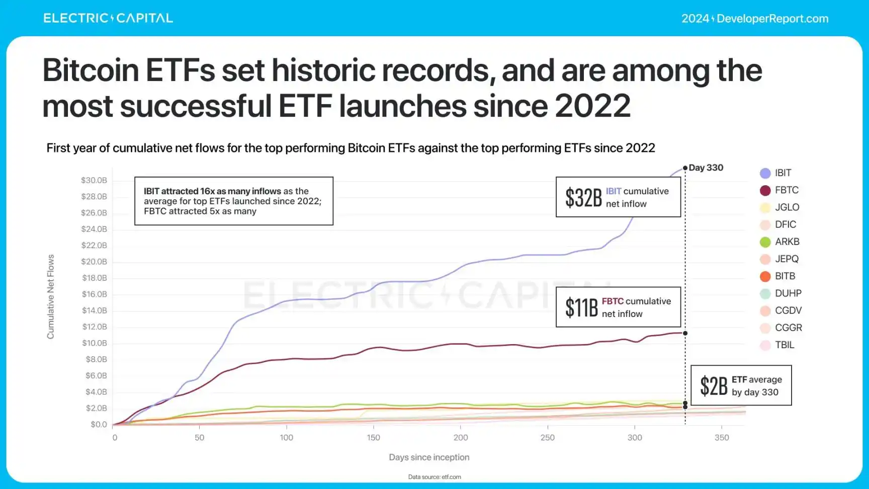 比特币和以太坊 ETF 今年上线,为场外资本提供了便捷的方式进入链上资产。比特币 ETF 吸引了超过 500 亿美元的净流入,成为历史上最成功的 ETF 之一。