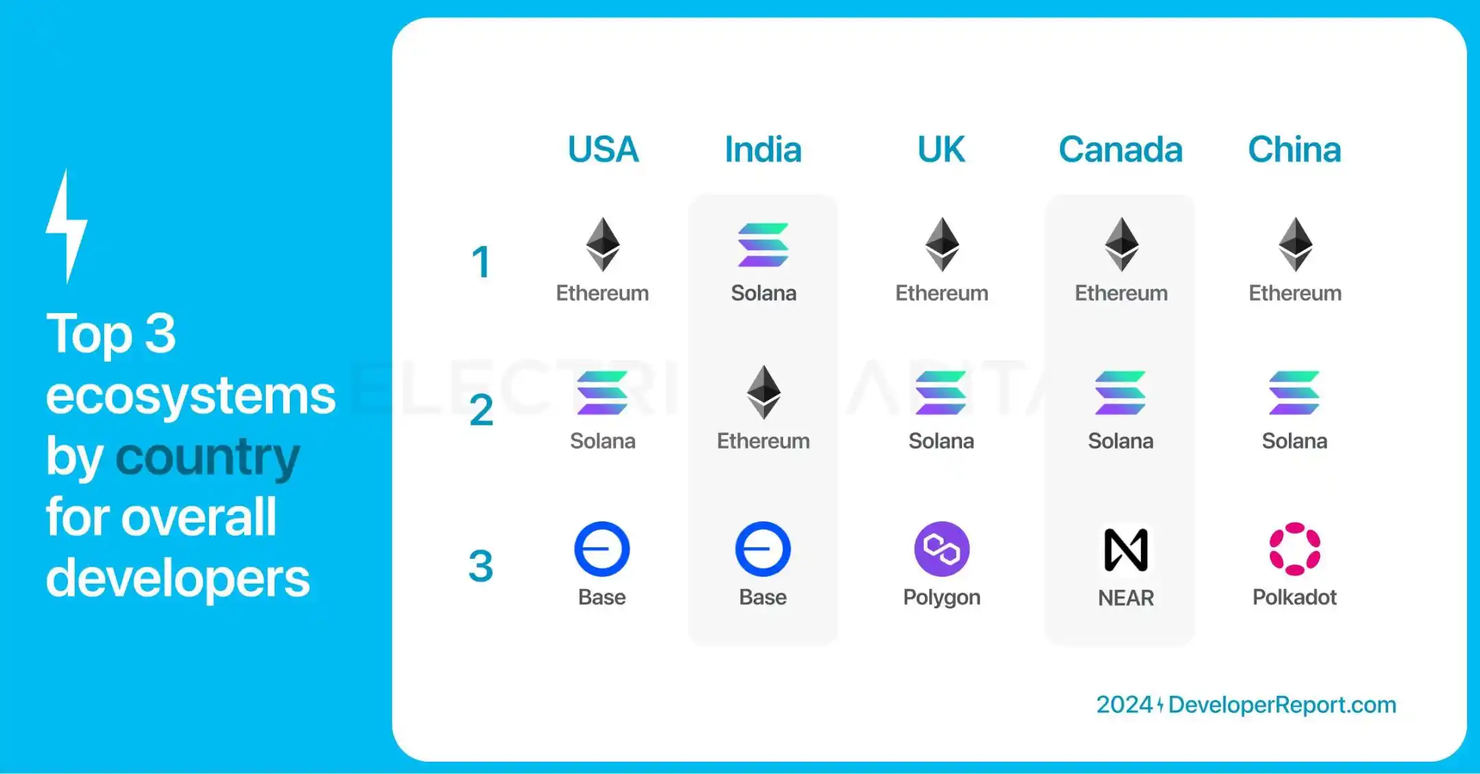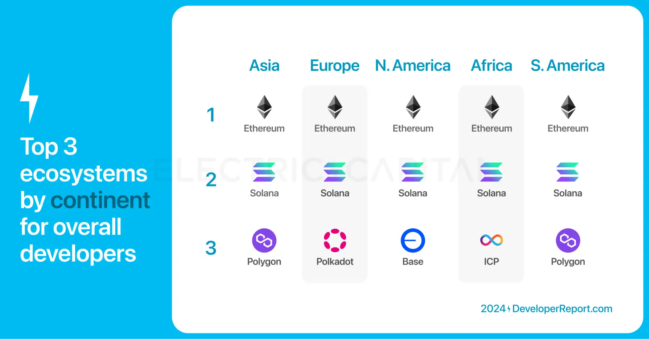 以开发者占比计算,以太坊在每个主要大陆板块都是排名第一的生态系统。