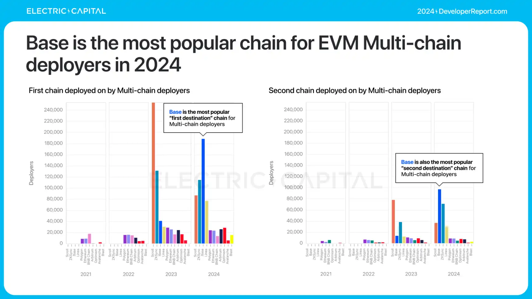 Base 是 2024 年 EVM 多链部署者最受欢迎的链,但 Base 的部署者倾向于留在 Base 链上。