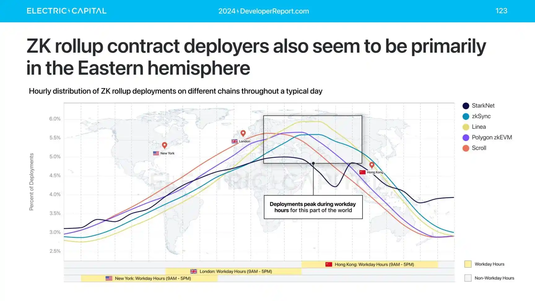 ZK Rollup 合约的部署者在东半球的工作时间内活跃,ZK 用户也是如此。