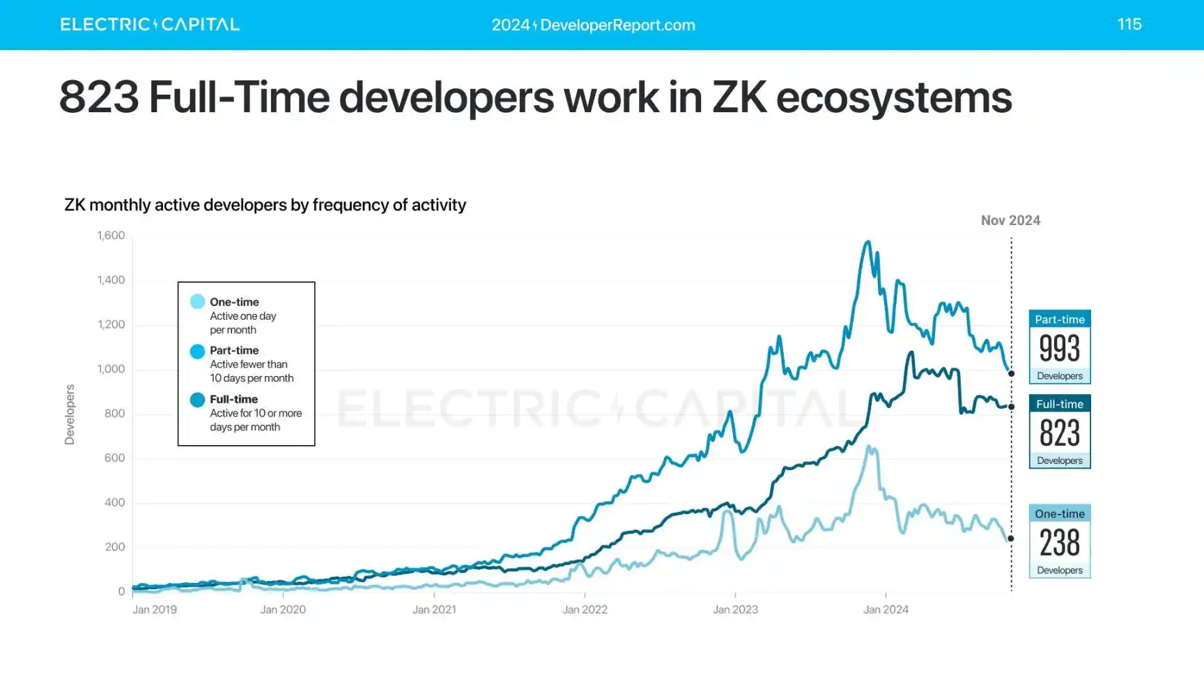 超过 2,000 名每月活跃的开发者在 ZK 生态系统中工作,其中 823 名是全职开发者,每月提交代码超过 10 天。