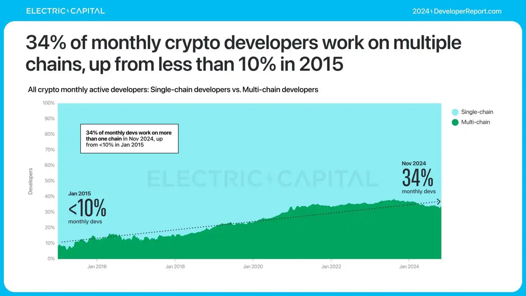许多开发者活跃在多个链上——现在,每三位加密开发者中就有一位在多个链上工作,并且这一趋势在不断增长。每月活跃的多链开发者从 2015 年的不到 10% 增加到了 2024 年的 34%。