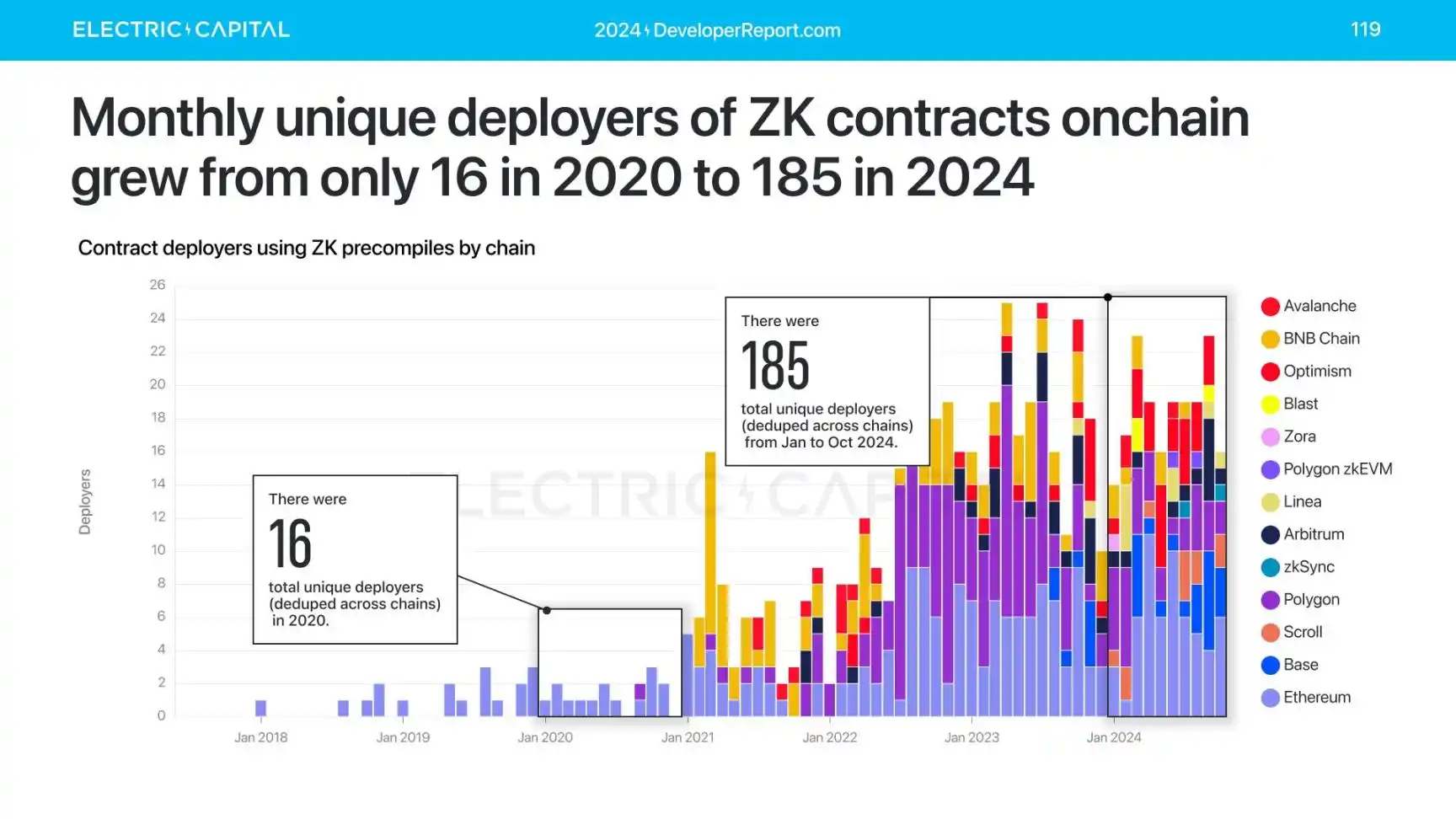 零知识证明(ZK)的链上部署也从 2020 年的 40 个增长到 2024 年的 639 个。
