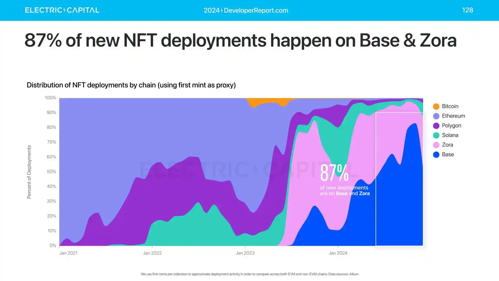NFT 部署达到了历史新高。87% 的新部署发生在 Base 和 zora 上。