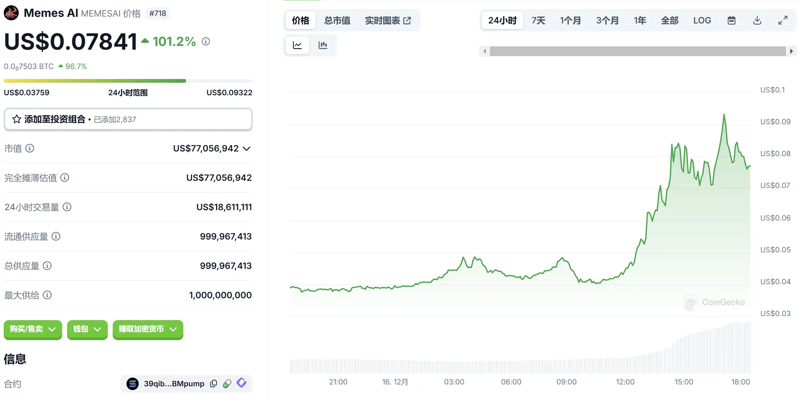 涨幅 + 97 个基点。FARTCOIN 如今已成为一个重要的讨论话题,主要是因为其近期市值飙升,超过了 GOAT,成为第二大人工智能模因币。尽管市值有所下降,但 FARTCOIN 的文化相关性和模因强度使其一直备受关注,许多人预测它可能成为排名前 25 的加密货币。该币的受欢迎程度源于其荒诞性和高回报潜力,常被与狗狗币等其他成功的模因币相提并论。围绕 FARTCOIN 的说法表明,它可能成为当前加密周期中的主要参与者,相关讨论强调了其达到新高度的潜力。