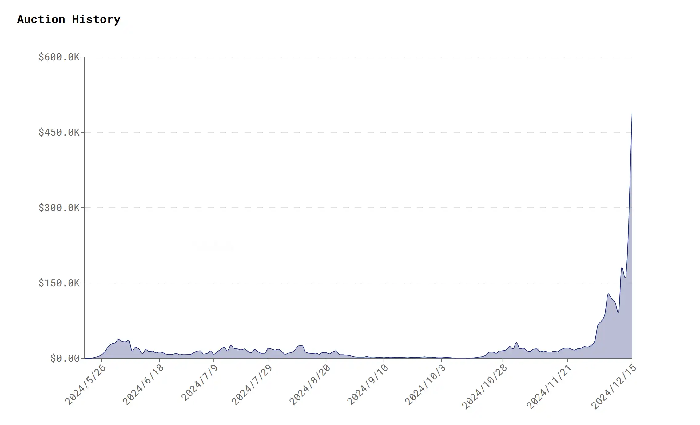 事实也确实如此,继 SOLV 12.8 万美元成交后,后续又有 FARM 18 万美元的拍卖价格,以及最近以 48 万美元天价成交的 MON。拍卖价格和 HYPE 的市值走势一样 10 天翻 4 倍,节节新高。