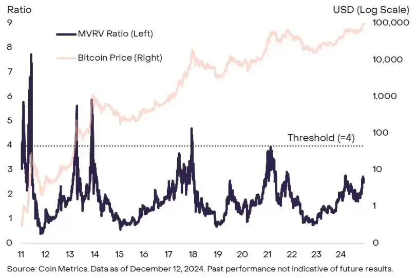 自 2009 年比特币诞生以来,加密货币市场已经取得了长足的进步,当前加密牛市的许多特点与过去不同。最重要的是,美国市场对现货比特币和以太坊 ETF 的批准带来了 367 亿美元的净资本流入,并帮助将加密资产纳入更广阔的传统投资组合。此外,我们认为,最近的美国大选可能会给市场带来更多的监管清晰度,并有助于确保加密资产在全球最大经济体中的永久地位。与过去相比,这是一个重大变化,此前观察人士一再质疑加密资产类别的长期前景。出于这些原因,比特币和其他加密资产的估值可能不会遵循早期的历史规律。
