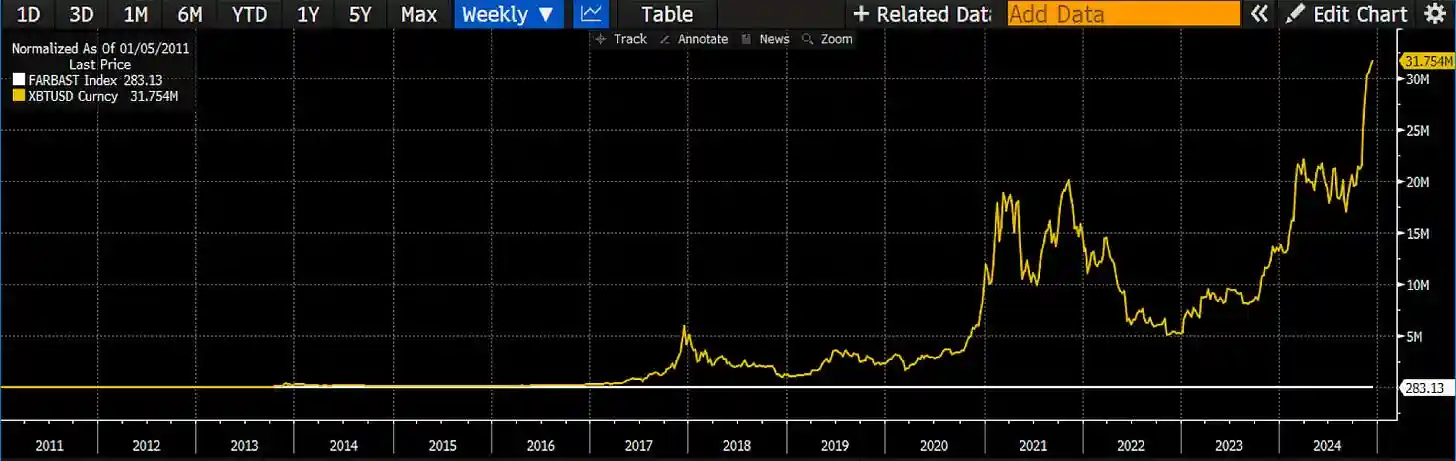 图中白线为美联储资产负债表,黄线为比特币价格,两者均以 2011 年 1 月 1 日的指数值 100 为基准。美联储资产负债表增长了 2.83 倍,而比特币价格则增长了 317,500 倍。