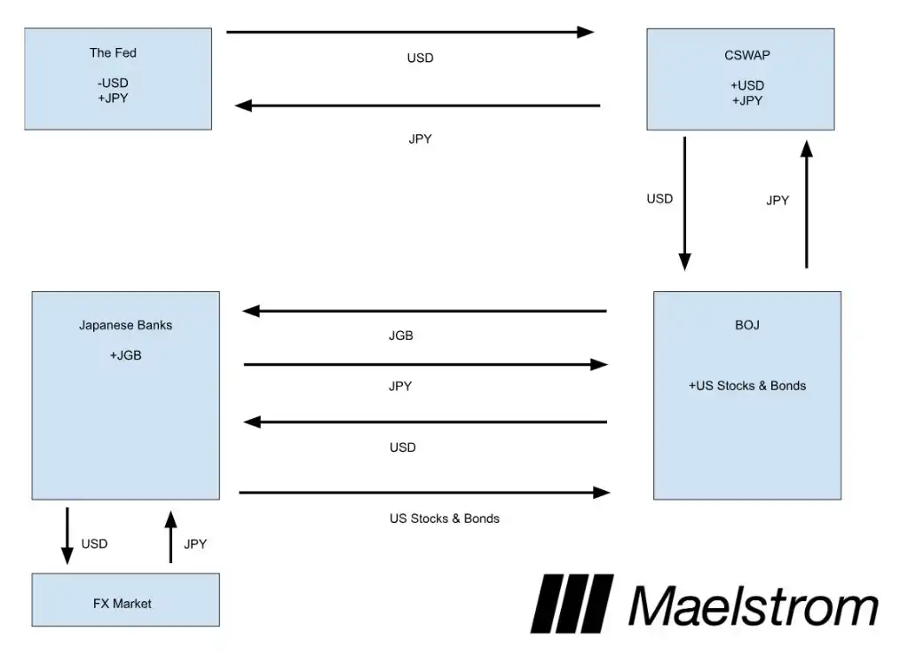 特朗普显然不希望日本的金融体系崩溃。美国在日本的海军基地对于遏制中国的海上扩张至关重要,而日本生产的半导体等关键产品也确保了美国能够获得稳定的供应。因此,特朗普可能会指示贝森特采取一切必要措施,确保日本的金融稳定。例如,贝森特可能会利用美国财政部的权力,与日本央行进行美元兑日元的货币互换 (CSWAP),以便场外吸收日本抛售的美国国债和股票。这种机制的具体流程可以参考我在 Spirited Away 一文中的描述: