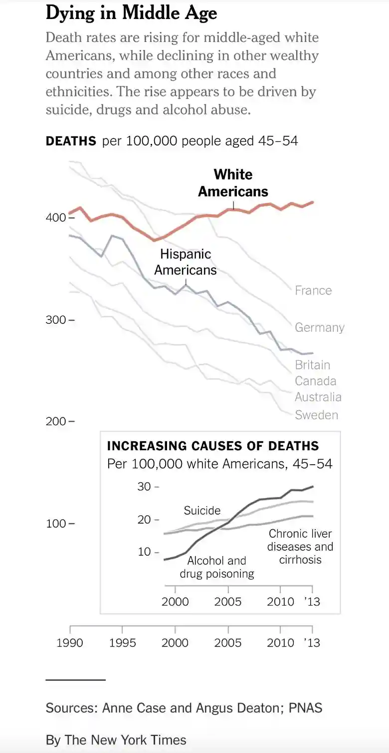 为了维持石油人民币体系,美国必须保持经常账户和贸易账户的赤字。这种结果导致了美国经济的去工业化和金融化。如果你想了解其机制,我建议阅读 Michael Pettis 的全部著作。我并不是说这就是世界应该改变经济体系的原因,但自 1970 年代以来,所谓的「美式和平」服务的普通美国白人男性显然已经失去了很多。这里的关键是「普通」一词;我并不是在谈论像 JP Morgan 的 CEO Jamie Dimon 和 Goldman Sachs 的 CEO David Solomon 这样的高层人士,也不是那些为他们工作的普通白领。我指的是那些曾经在 Bethlehem Steel 有一份工作、有自己的房子和伴侣的普通人,而现在他们唯一接触的女性可能是美沙酮诊所的护士。这一点显而易见,因为这一群体正在通过酒精和处方药缓慢自杀。相较于二战后他们曾经享有的高生活水平和工作满意度,如今的状况显然糟糕透顶。众所周知,这正是特朗普的基本盘,他以一种其他政治家不敢的方式与他们对话。特朗普承诺将工业带回美国,为他们悲惨的生活重新注入意义。