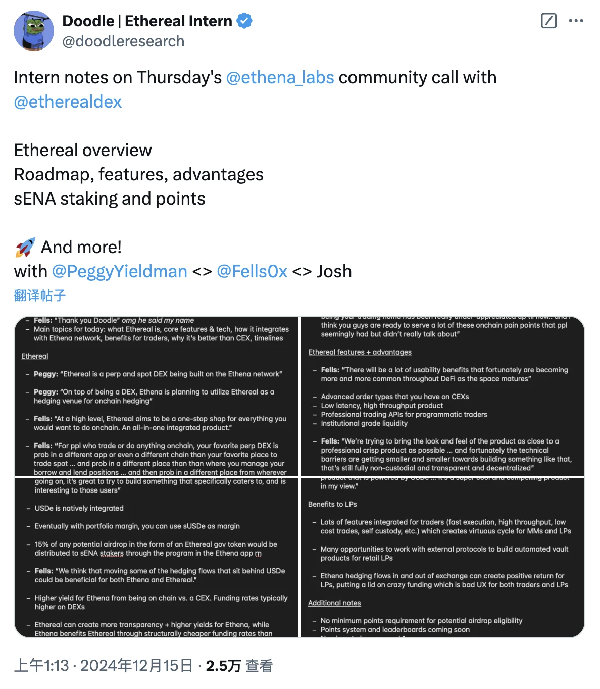 Ethena生态首个空投项目Ethereal:明年Q1上主网;计划15%代币空投给ENA质押用户