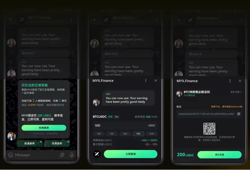 为了进一步加强「增长引擎」的马力,MYX Finance 在上个月上线了 Telegram mini app——目前,Telegram 拥有庞大的 8 亿用户基数,90% 的加密用户都使用 Telegram 进行社交,通过整合「社交+交易」,MYX Finance 的 TG 小程序极大缩减了 Telegram 用户的「交易路径」。用户进入 MYX 小程序后可以通过推特、facebook 等社媒账号或者手机、邮箱登录,自动为用户创建钱包,极大降低了 Telegram 上 Web2 用户的学习成本和使用成本。根据后续公布的产品计划,MYX Finance 将迎来一批交易 KOL 入驻并上线「跟单功能」,真正在链上打通「社交+交易」,用户聊完行情、吹完牛、听完分析或者在 KOL 分享交易策略后,可以一键跟单,紧跟大牛操作。