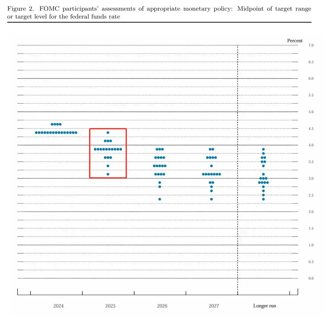 美联储主席杰罗姆·鲍威尔在新闻发布会上明确表示,尽管此次降息符合市场预期,但未来降息的频率和幅度可能远低于之前的市场假设。鲍威尔强调,2025 年美联储仅计划降息两次,此外还上调了 2025 年的通胀预期,从此前的 2.1% 提升至 2.5%。这一调整反映了美联储对未来通胀压力的深切担忧。