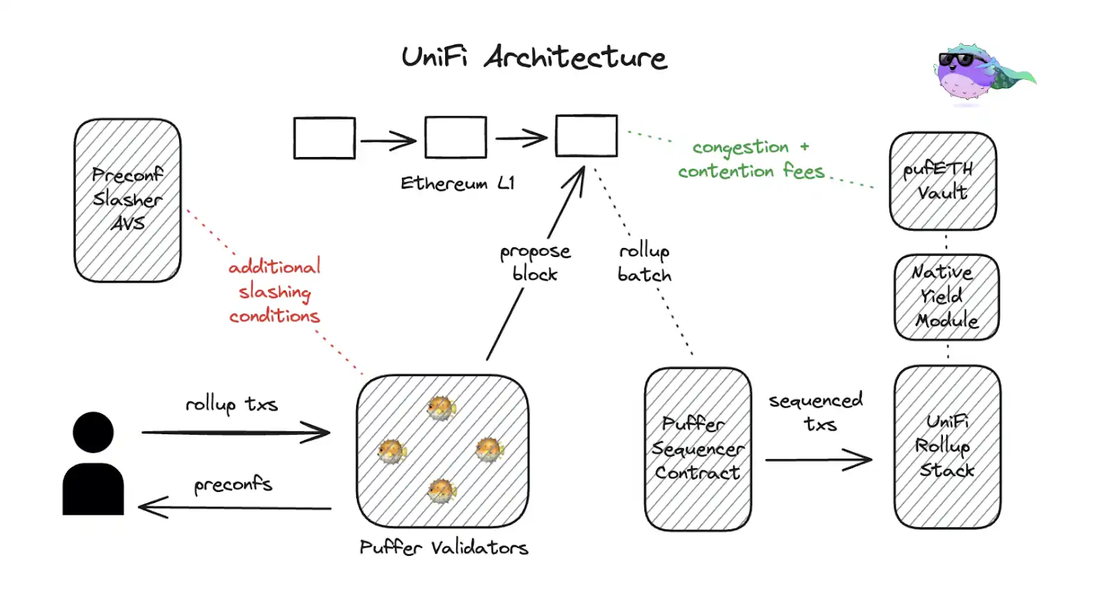 架构概览 - Puffer 的 UniFi 预确认 AVS 为用户提供 L2 执行确认服务。用户通过 UniFi 进行交互时,可体验到亚秒级的交易速度。在 UniFi 通用 Rollup 中,原生收益代币可被用作燃料(Gas)代币。