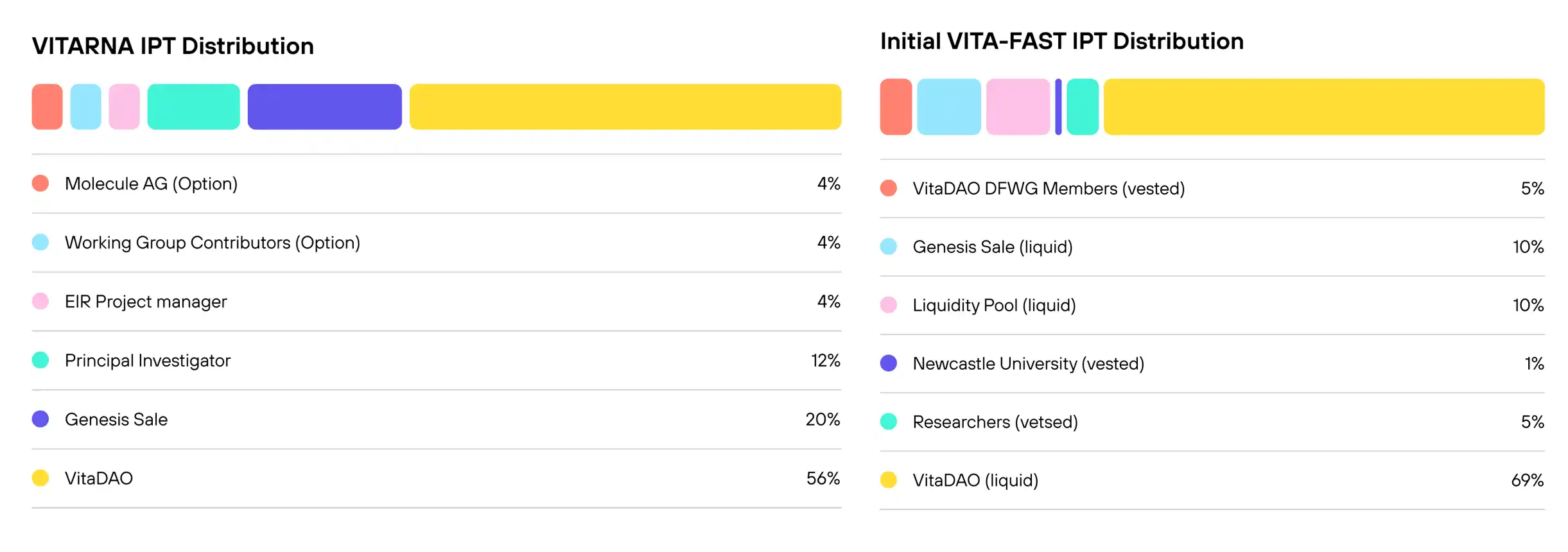 IPT 是由 Molecule Catalyst 平台首创的知识产权代币,代表对生成的科研 IP 的部分治理权。这些代币让持有者有机会直接参与研究的开发、决策和未来方向。每个 BioDAO 通常持有一个 IP 代币组合,代表与 BioDAO 的特定科学研究领域相关的知识产权。目前,最受认可的 IPT 是 VitaDAO 开发并拥有的 IPT VitaRNA 和 VITA-FAST。