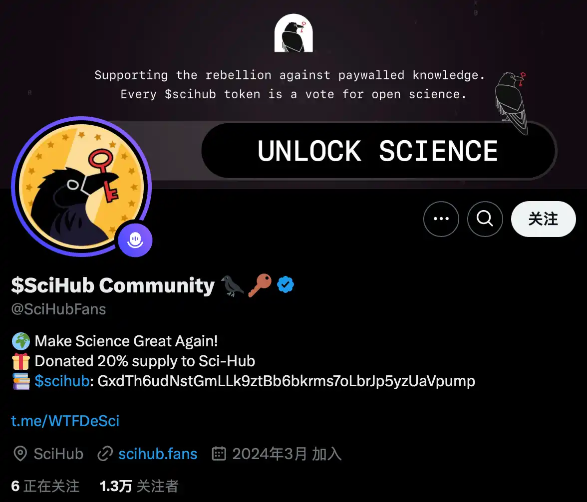 Scihub 灵感源自全世界最大的免费论文下载中心 Sci-hub,其因开源面临法律问题,平台仅靠捐赠维持。0xAA(@0xAA_Science) 是该代币的 TOP1 持有者,目前持有总量 22% 的代币,他表示会将 20% 代币捐赠给 SciHub 的运营者,表示对其事业和平台发展的支持。