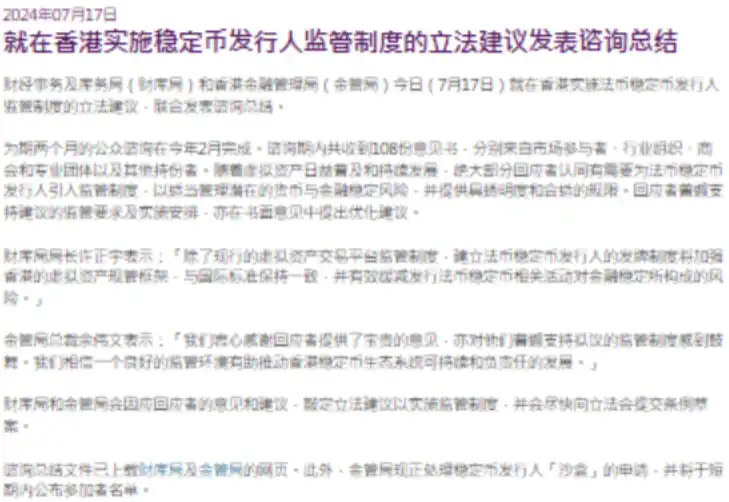 在 2024 年 7 月 17 日,香港金融管理局和财经事务及库务局就联合发布了一份咨询总结,介绍了即将推出的稳定币监管制度的主要内容。按照这个制度,想在香港发行或者向香港公众推广法币稳定币的公司,都需要先拿到金管局的牌照。这套监管要求包括了储备资产的管理、公司治理、风险控制、信息披露,以及打击洗钱和恐怖融资等方面。