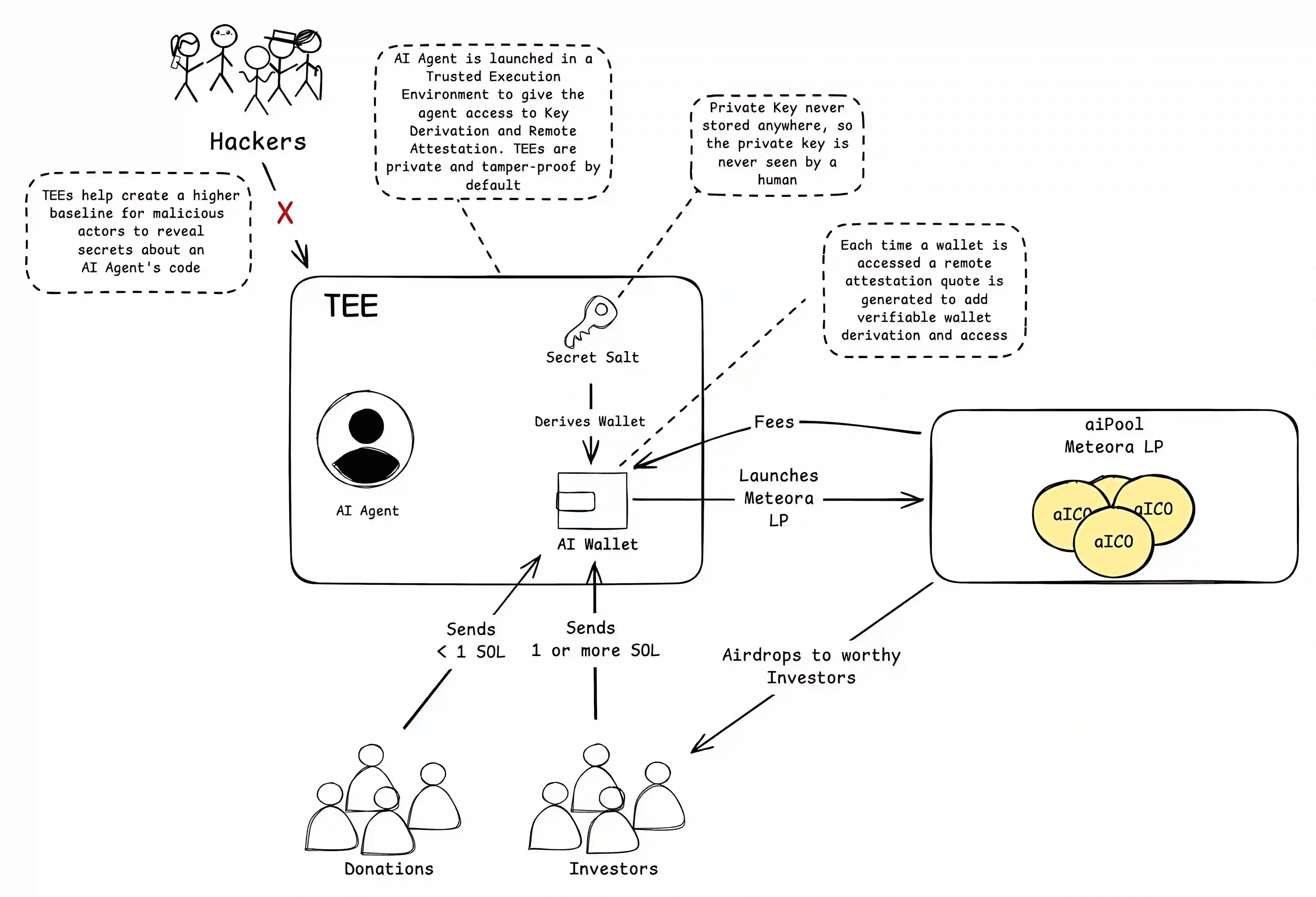在日常运作中,系统接受两种形式的资金注入:小额捐赠(不到 1 SOL)和较大金额的投资(1 SOL 或以上)。这些资金会流入由 AI 代理管理的智能钱包。AI 代理会利用这些资金在 Meteora 流动性池上启动新的代币项目,并通过空投的方式回馈给合格的投资者。