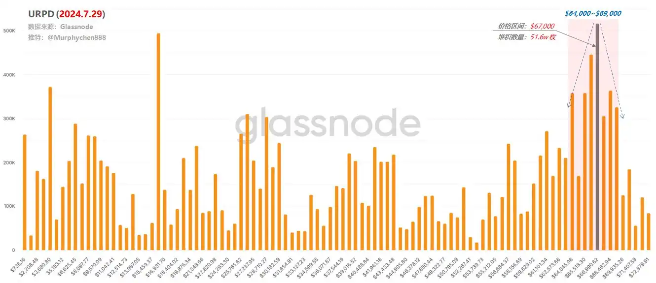 当时在$64,000~$69,000 形成筹码堆积区,在$67,000 处产生了一个堆积了 52w 枚 BTC 的巨量柱,并以此为中心峰值向两边递减,形成区域性价格支撑。相信小伙伴们还记得,在此后很长一段时间 BTC 的价格都没有效跌穿过这个价格区间。即便是 8 月 5 日和 9 月 7 日的开始远离该区间,但该区间筹码结构始终未被破坏。在一段时间后,BTC 价格又会回到该区间(产生引力)。