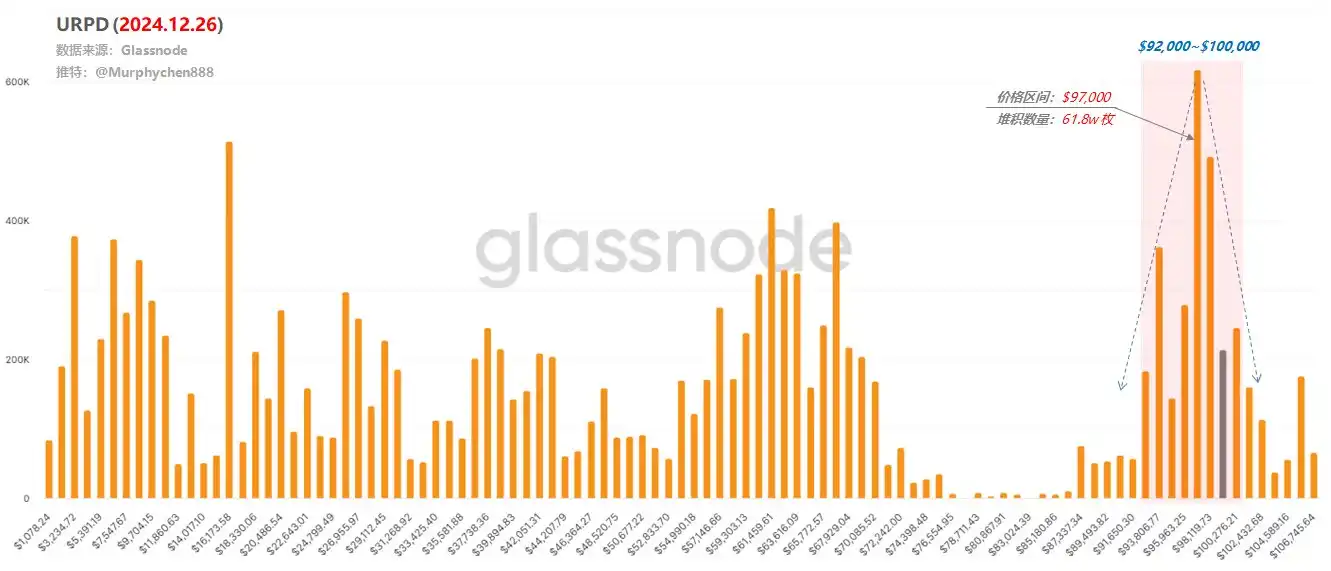 从当前的数据看,链上结构正在$92,000~$100,000 范围内逐步形成筹码堆积区,其中$97,000 处产生了一个高达 60w 枚 BTC 巨量柱,并以此为中心峰值向两边递减。