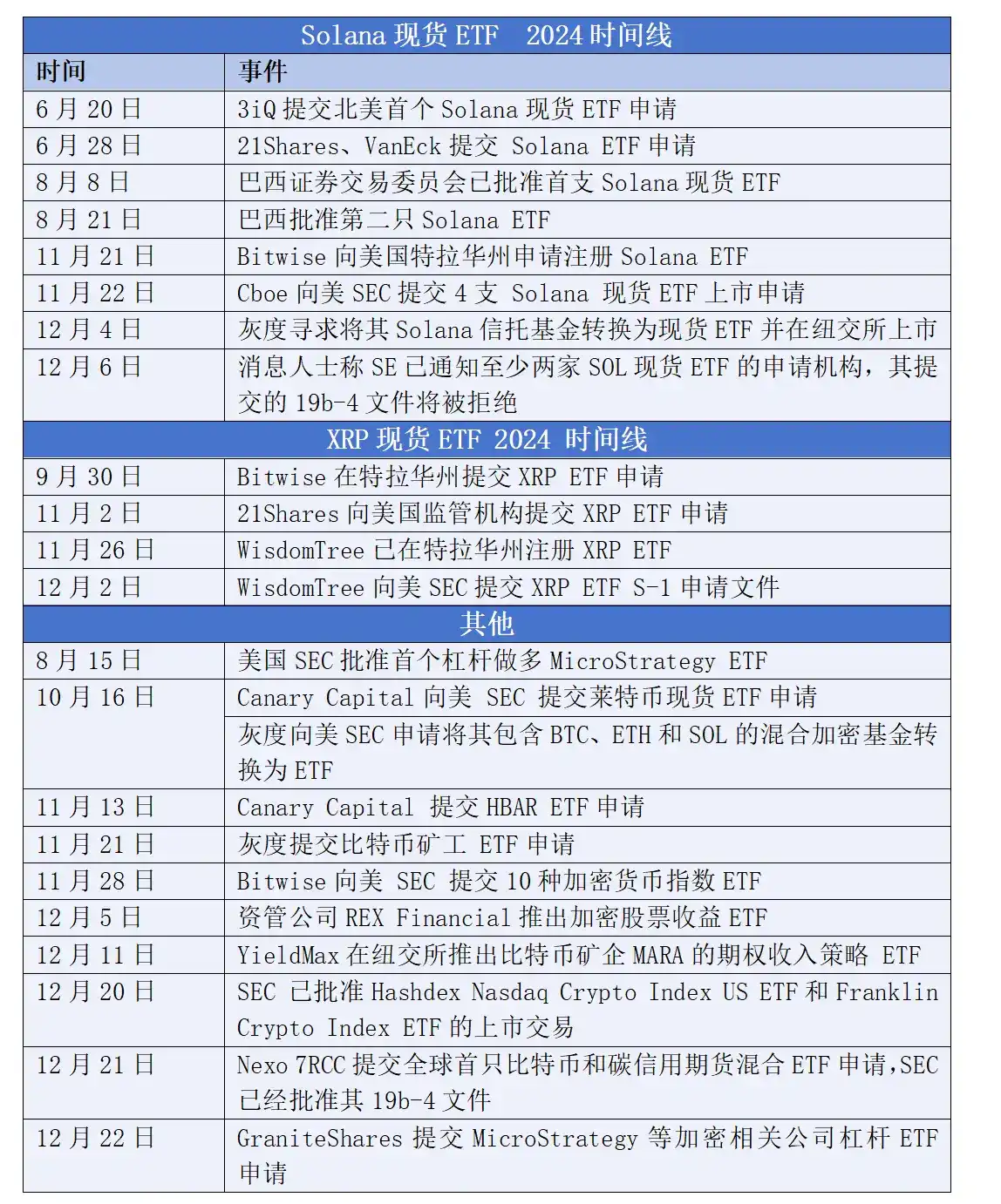 在比特币和以太坊现货 ETF 批准后,Solana 现货 ETF 也在 2024 年经历了一系列重要的推进。6 月 20 日,北美首个 Solana 现货 ETF 申请被提交,标志着 Solana ETF 正式步入公众视野。随后, 21 Shares 和 VanEck 也相继向 SEC 提交了 Solana ETF 的申请。