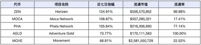 过去一周市场代币涨幅前 5 名(未计入交易量过小的代币和 meme 币),数据来源:Coinmarketcap