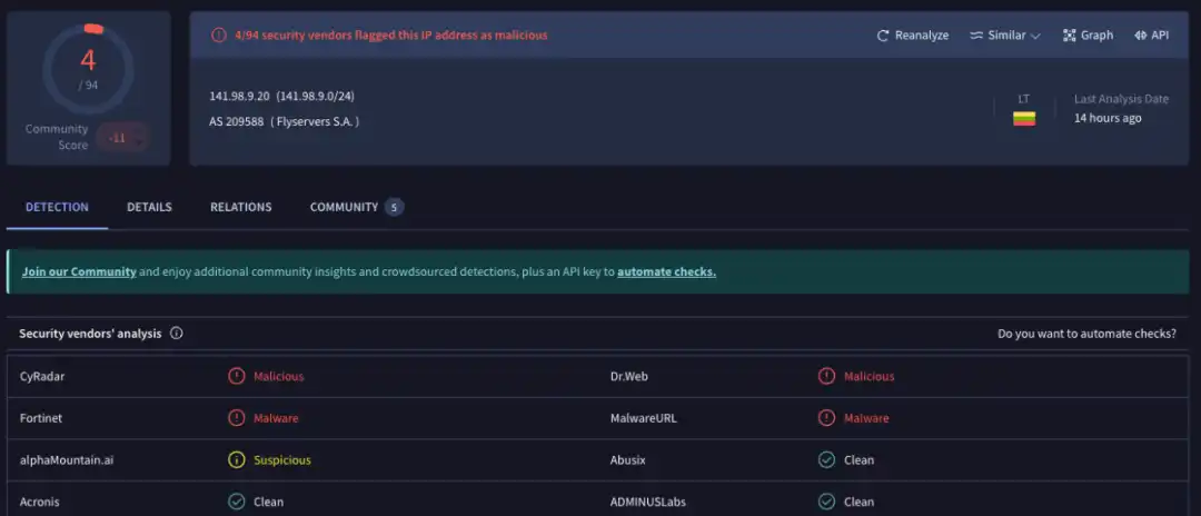(https://www.virustotal.com/gui/ip-address/141.98.9.20)