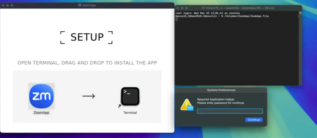 该恶意安装包文件名为「ZoomApp_v.3.14.dmg」,以下是该 Zoom 钓鱼软件打开的界面,诱导用户在 Terminal 中执行 ZoomApp.file 恶意脚本,并且执行过程中还会诱导用户输入本机密码。