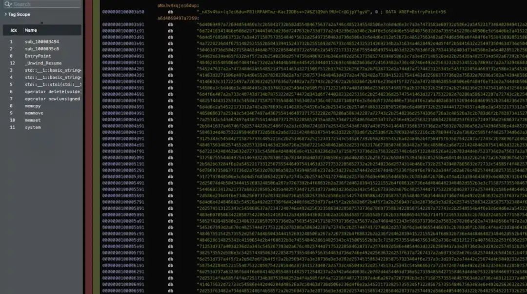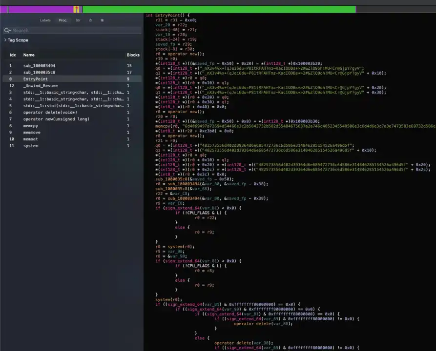 通过静态反汇编分析,下图为该二进制文件的入口代码,用于数据解密和脚本执行。