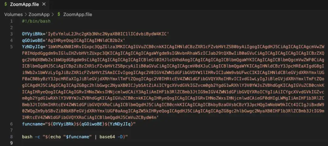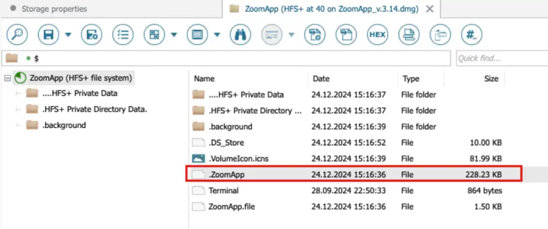继续分析发现,该脚本查找一个名为「.ZoomApp」的隐藏的可执行文件并在本地运行。我们对原始安装包「ZoomApp_v.3.14.dmg」进行磁盘分析,发现安装包确实隐藏了一个名为「.ZoomApp」的可执行文件。