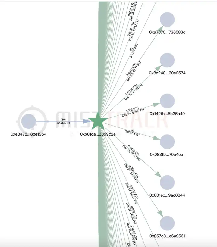 据 MistTrack 显示,黑客地址曾收到来自地址 0xb01caea8c6c47bbf4f4b4c5080ca642043359c2e 转入的小额 ETH,疑似为黑客地址提供手续费。该地址(0xb01c)的收入来源只有一个地址,却转出小额 ETH 到近 8,800 个地址,似乎是一个「专门提供手续费的平台」。