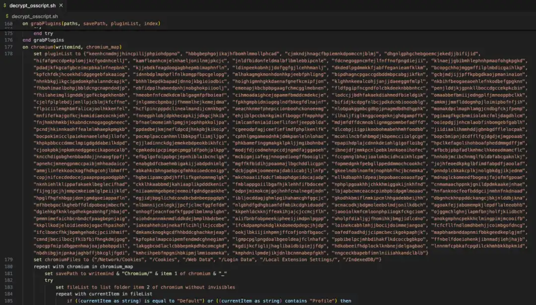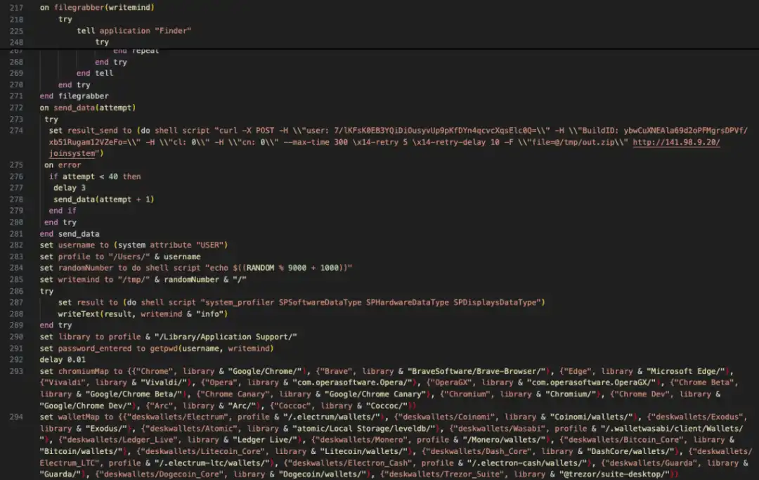 通过对数据解密后发现该二进制文件最终同样执行恶意的 osascript 脚本(完整解密代码已分享到:https://pastebin.com/qRYQ44xa),该脚本会收集用户设备上的信息并发送到后台。