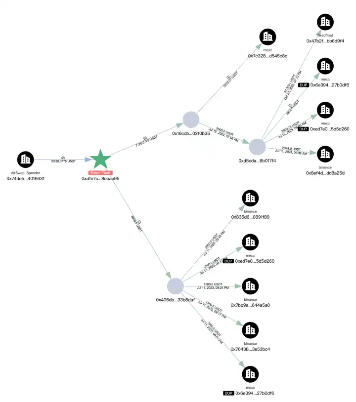 新地址(0xdfe7)的 USDT 交易痕迹也非常多,被转出到 Binance, MEXC, FixedFloat 等平台。