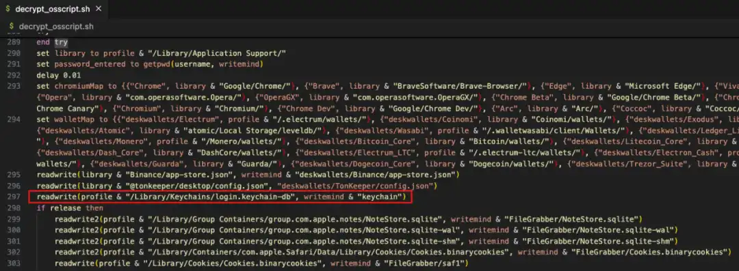 由于恶意程序在运行时就诱导用户输入密码,并且后续的恶意脚本也会采集电脑中 KeyChain 数据(可能包含用户保存在电脑上的各种密码),黑客收集后就会尝试解密数据,获得用户的钱包助记词、私钥等敏感信息,从而盗取用户的资产。