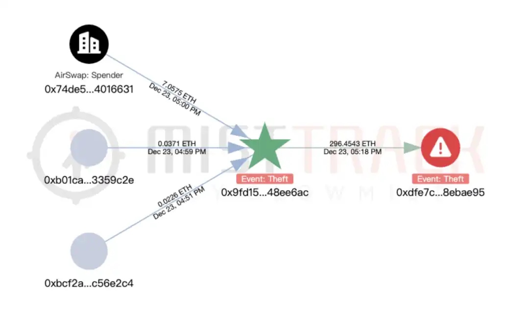 接着分析被盗资金的转出情况,共有 296.45 ETH 被转移到新地址 0xdfe7c22a382600dcffdde2c51aaa73d788ebae95。