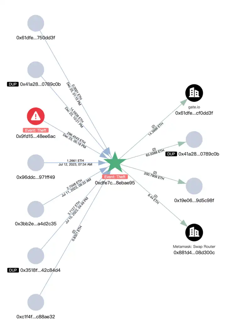 以上扩展地址后续的转出与多个平台如 Bybit, Cryptomus.com, Swapspace, Gate.io, MEXC 关联,且与被 MistTrack 标记为 Angel Drainer 和 Theft 的多个地址相关。除此之外,目前有 99.96 ETH 停留在地址 0x3624169dfeeead9f3234c0ccd38c3b97cecafd01。
