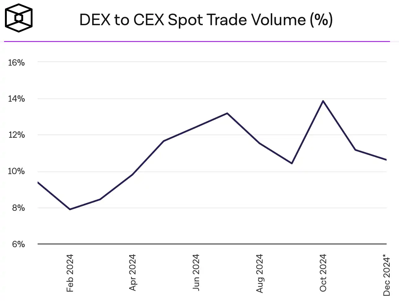 今年 7 月,The Block 发布了一份数据统计,DEX 与 CEX 现货交易量的市场比率在年中来到了 13.76%,超过 2023 年 5 月的 13.7%,创下历史新高。6 月份,CEX 交易量为 1.11 万亿美元,同期 DEX 交易总量则为 1230 亿美元,而短短 3 个月后,这个数字便翻了一番,在 10 月份达到近 3000 亿美元。