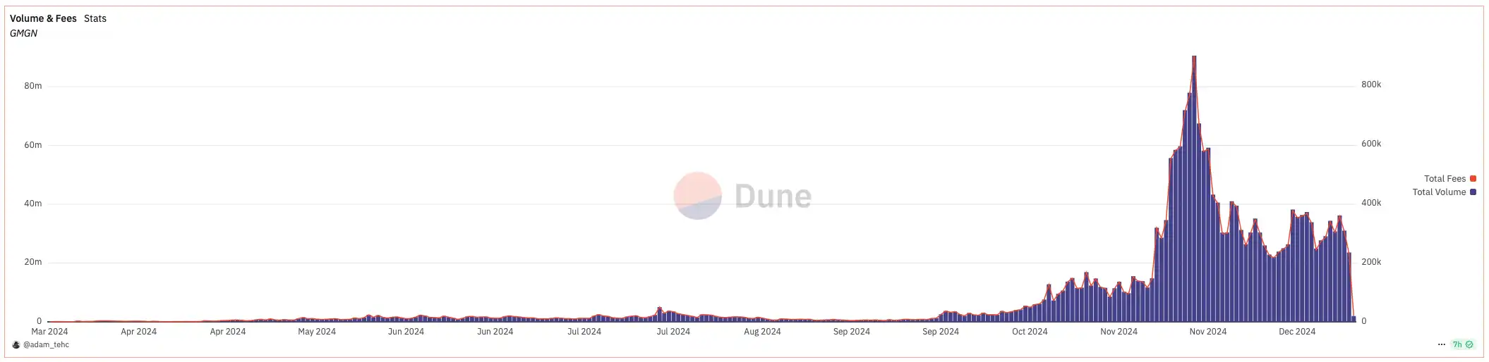 这一探索开启了代币分析+交易 Bot 一体化的赛道新趋势,随后出现的 Cash Cash Bot、DEXX 等平台均针对代币信息与交易的结合体验上进行优化,甚至一度传出「链上 Binance」的宣传标语。通过 API 手续费创造额外收益,改变了过去代币分析类工具依靠广告为主的变现方式。根据 Dune 数据统计,在 11 月 meme 交易高潮期间,通过 GMGN API 完成的日交易量最高达到了 9000 万美元,而该月 GMGN 平台通过 API 手续费实现的平均日收益则有近 40 万美元之多。