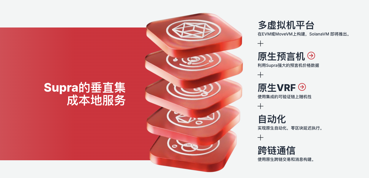 市场已经疲于老生常谈的乐高——可组合性,而是对安全可靠和完整稳定的系统更为看重。而「一体化」常常意味着把多层次、多模块的功能整合到同一个网络之中,实现安全性、性能和易用性之间的平衡。对于 Supra 而言,核心目标就是让开发者能够在同一条公链上完成包括预言机、跨链通信、随机数(dVRF)和自动化等需求,省去频繁对接外部协议或部署子链的麻烦。具体来说,Supra 通过以下几个关键模块,为「一体化未来」奠定了坚实的技术和经济基础。