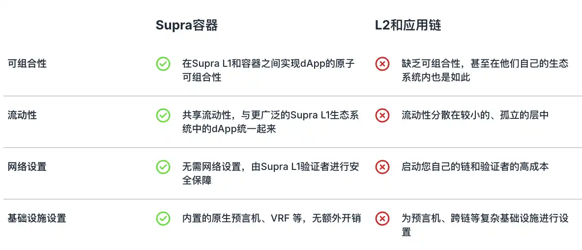 为解决这类难题,Supra 引入了「容器化」(Containers)概念。容器就像一条「附着在主网之上的微链」,项目方可以在容器中定制自己的代币模型、治理机制或经济激励方案,保有相对独立的运作空间。同时,容器与 Supra 主网之间保持着高度的互通性:一方面能与主网共享流动性池和安全共识,另一方面容器也可以借助主链内置的预言机、跨链通信等功能「即插即用」。