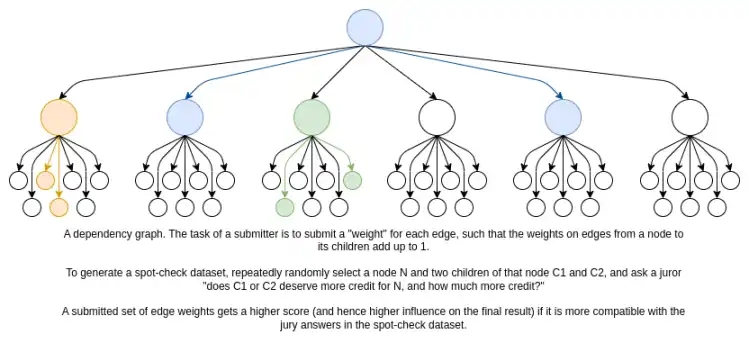 · 依赖关系图。我们不是问每个陪审员一个全球性问题(「项目 A 对人类的价值是什么?」),而是问一个局部问题(「项目 A 或项目 B 对结果 C 更有价值?价值多少?」)。人类在回答全球性问题方面是出了名的糟糕:在一项著名的研究中,当被问及他们愿意花多少钱来拯救 N 只鸟时,受访者对 N = 2000、N = 20000 和 N = 200000 的回答大致都是 80 美元。局部问题更容易处理。然后,我们通过维护一个「依赖关系图」将局部答案组合成一个全局答案:对于每个项目,哪些其他项目对其成功有贡献,贡献多少?