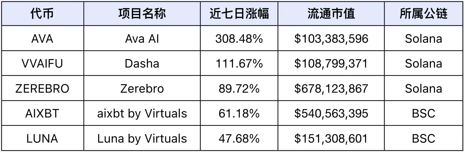 本周 Meme 币市场主要集中在 AI 相关项目上,受益于 AI Agent 自主发币带来的造富效应,AI Meme 项目获得显著涨幅。这一趋势反映出市场资金正在追逐 AI 相关概念,但也显示出投机性特征增强。