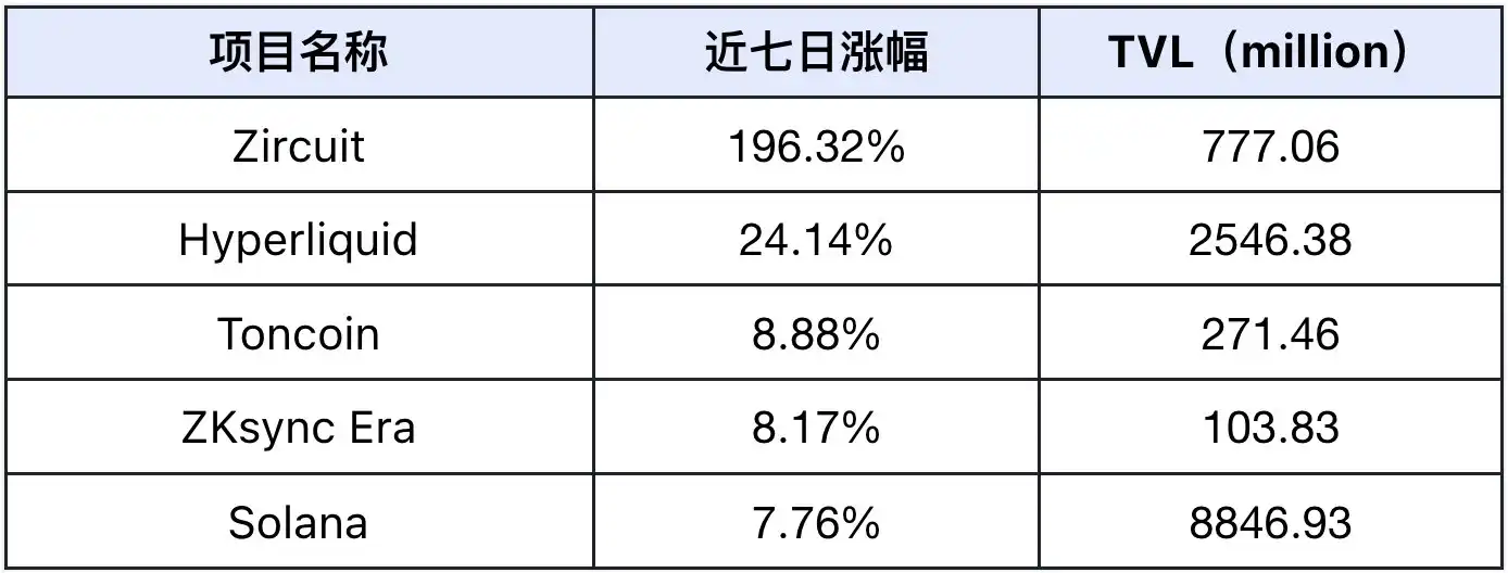 过去一周市场公链 TVL 涨幅前 5 名(未计入 TVL 较小的公链),数据来源:Defilama
