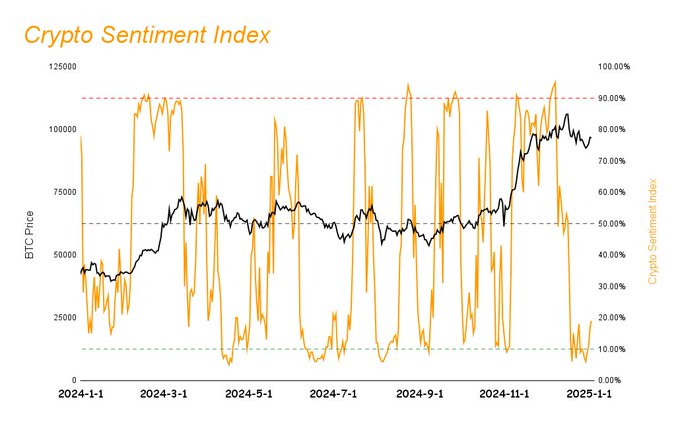 市场情绪指数由上周的 10% 上升至 19%,虽仍处于恐慌区间,但已显示出回暖迹象。尽管目前仍处于元旦假期期间,市场流动性未完全恢复,但资金已开始逐步回流加密货币市场。Altcoin 本周整体表现强于基准指数,但预计短期内将与基准指数保持同步走势。
