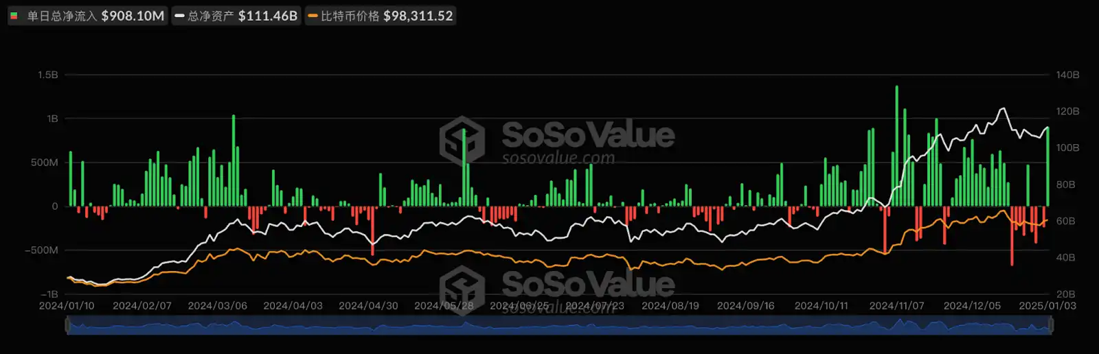 据 SoSoValue 数据显示,进入 1 月以来,比特币 ETF 现货再度实现净流入,目前其总资产净值达 1114.6 亿美元,ETF 净资产比率(市值较比特币总市值占比)达 5.72%,历史累计净流入达 359.1 亿美元。