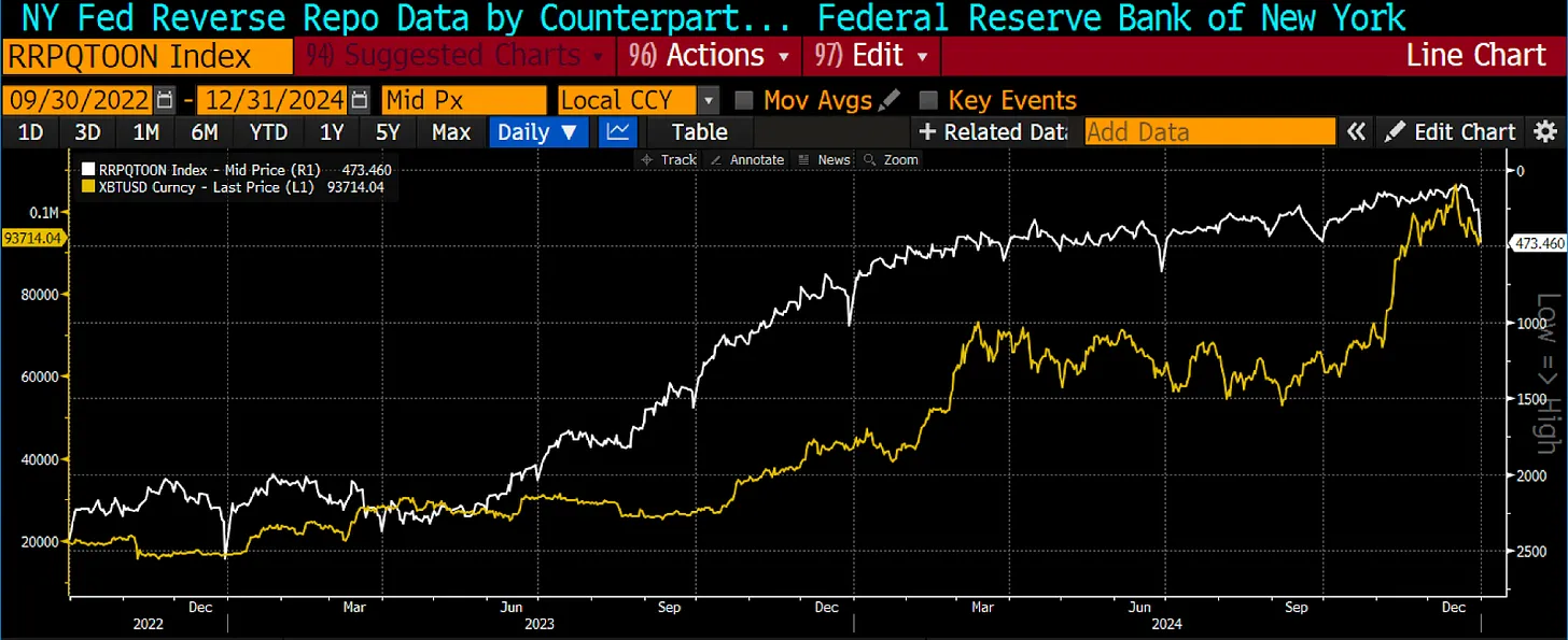 比特币在 2022 年第三季度触底,当时美联储的逆回购工具(RRP)达到了顶峰。在美国财政部长耶伦(外号「坏女孩耶伦」)的推动下,美国财政部减少了长期票息债券的发行,同时增加了短期零息债券的发行,从而从 RRP 中抽取了超过 2 万亿美元。