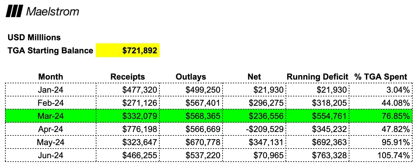 当不提高债务上限会导致到期的国债技术性违约或政府完全停摆时,提高债务上限变得至关重要。根据财政部发布的 2024 年收支数据,我估计这种情况将在今年 5 月到 6 月之间发生,届时 TGA 余额将被完全耗尽。