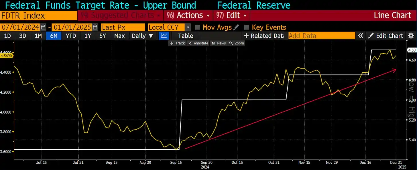 逆回购工具(RRP)已几乎降至零,为了彻底耗尽该工具的资金,美联储迟迟调整了 RRP 的政策利率。在 2024 年 12 月 18 日的会议上,美联储将 RRP 利率下调了 0.30%,比政策利率的降幅多出 0.05%。此举旨在将 RRP 利率与联邦基金利率(FFR)的下限挂钩。